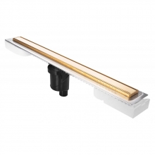 Длина: 900 мм; Ширина: 61 мм; Фактура: глянцевая; Монтаж: в пол; Цвет: золото; Решетка и рамка, нержавеющая сталь AISI 304; Двусторонняя установка решетки: металл и вклейка плитки с регулировкой по толщине плитки от 8 до 30мм; Сетка для волос, пластик; Желоб водосток, нержавеющая сталь AISI 304; Комплект гидроизоляции; Монтажная заглушка и регулируемые по высоте ножки, пенопласт; Самопромывный S-образный сифон РР: горизонтальный выпуск D50 H60, пропускная способность 42л/мин, монтаж 360 градусов.
