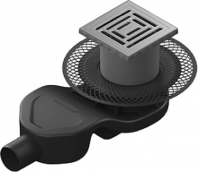 Решетка 3 мм, нержавеющая сталь AISI 304; Монтажная заглушка, пластик; Комбинированный гидрозатвор, пластик; Горловина трапа и эксцентрик, пластик; Комплект гидроизоляции; Возможность вклейки плитки; Самопромывный S-образный сифон РР: горизонтальный выпуск D50 H60, пропускная способность 42 л/мин, монтаж 360 градусов; Доп опция: вертикальный сифон D50-110.