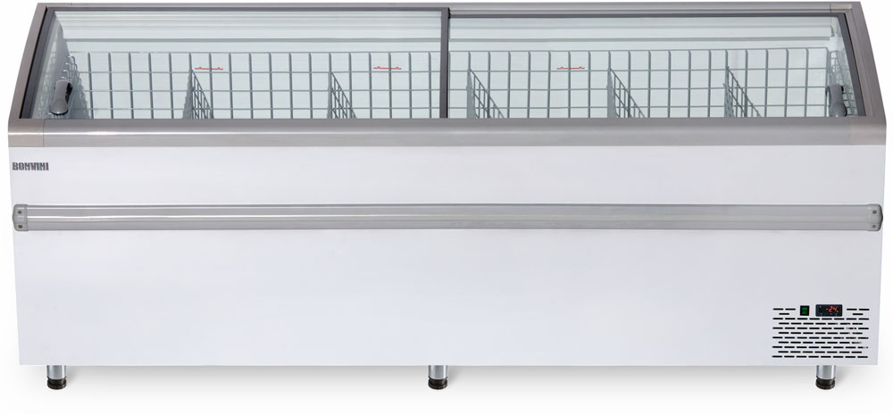 два стекла легко снимаются для более быстрой загрузки товара в оборудование, стекла обрамлены теплосберегающими профилями Rehau, врезные ручки, сетчатые полки и корзинки, есть возможность хранения товара под корзинками