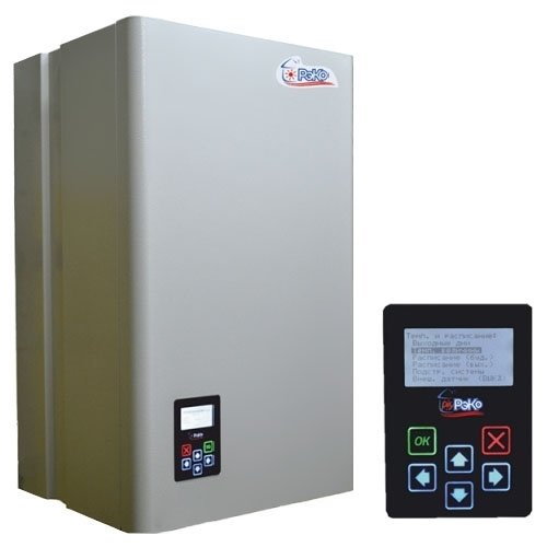 Одноконтурный котел РЭКО 5ПМ с электрическим нагревом с дополнительными элементами, позволяющими работать ему как небольшая котельная. Основная конструкция отопительного устройства состоит из теплообменника с ТЭНами, элементов коммутации (симистор и автоматические выключатели), установленных на подложке, закрытых кожухом. Управляющая электроника.