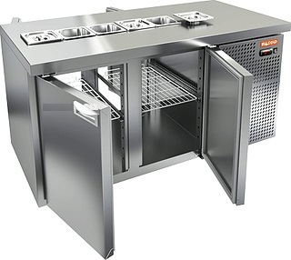 оборудование с обеих сторон оснащено распашными дверьми, что облегчает доступ к выложенной продукции, стол полностью выполнен из нержавеющей стали, электронный контроль температуры, автоматический режим разморозки (оттайки) испарителя, принудительная вентиляция по всему объему стола