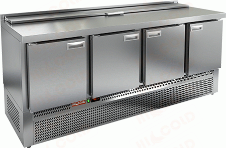 стол полностью выполнен из нержавеющей стали, электронный контроль температуры, автоматический режим разморозки (оттайки) испарителя, принудительная вентиляция по всему объему стола