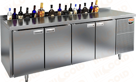 оснащен ванной для льда под бутылки, регулируемые по высоте ножки, цельнозаливной корпус из нержавеющей стали, автоматические доводчики дверей с фиксатором открытого положения, термическое выпаривание конденсата, новая экономичная модель компрессора, нагрузка на полку: 50 кг