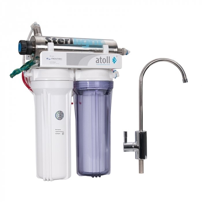 Получить максимально качественную и безопасную питьевую воду возможно с применением современного двухступенчатого фильтра Atoll (Атолл) D-21u STD. Представленное устройство оснащено ультрафиолетовой лампой, с помощью которой осуществляется обеззараживание воды.