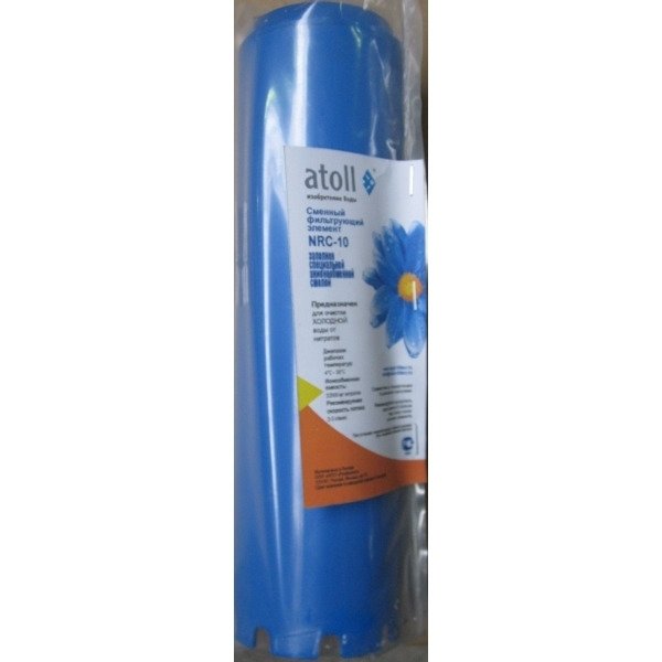 Atoll (Атол) NRC-10 – анионообменный картридж, который используется для того, чтобы удалять различные органические загрязнения, нитраты, именно в холодной воде. Данный картридж является сменным элементом и эксплуатируется в системах обратного осмоса. Помимо этого, стоит отметить, что данный картридж содержит особую анионообменную смолу. Рассматриваемый прибор отличается небольшими габаритами, а также компактным весом. Таких размеров удалось достичь за счёт продуманной конструкции представленного аксессуара. Данный прибор актуален для стандартных 10-дюймовых корпусов.