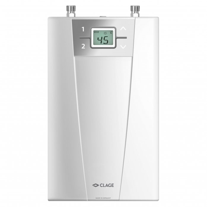 Clage CEX 11/13 U проточный водонагреватель с верхней разводкой, что дает установку под раковиной. Перед пуском выбирается на какой мощности будет работать водонагреватель. Проточный водонагреватель может послужить хорошей заменой и накопительным водонагревателям и централизованному ГВС. Все текущие данные и настройки будут выведены на ЖК- дисплей, в т.ч. и ошибки.