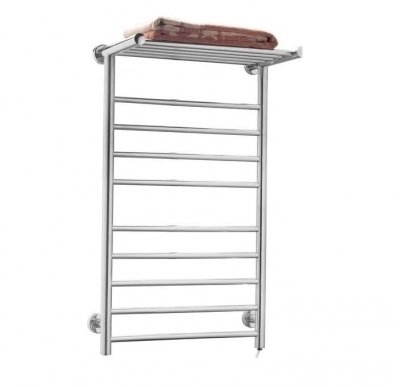 В серии электрических полотенцесушителей Domoterm 109-Т5 Аврора с полкой десять нагреваемых поперечных перекладин дополнены верхней, также нагреваемой, полкой. Этот элемент очень удобен и способствует более быстрой сушке белья, обеспечивая более эффективный теплообмен. Хотя эта серия полотенцесушителей и обладает повышенной, по сравнению с другими, потребляемой мощностью (130 Вт), изделие достаточно экономично.