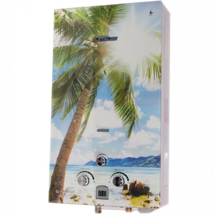 Уникальный дизайн и производительность являются главными преимуществами газового водонагревателя проточного типа Etalon Y 10 GI (Пальма). Модель оборудована системой электронного розжига от батареек, что обеспечивает автоматическое включение и выключение колонки. Замена батареек не занимает много времени и не требует особых навыков.
