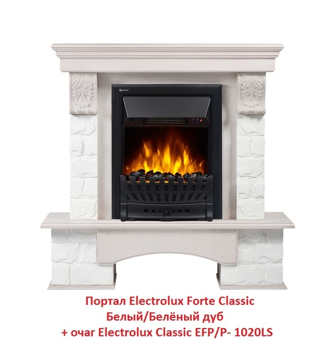 Electrolux (Электролюкс) Forte Classic Белый/Белёный дуб – уникальный портал, имеющий красивый и самобытный дизайн. Портал актуален для такого очага, как Classic EFP/P - 1020LS этого же производителя. В силу особенностей дизайна портала, особенно изящно он будет смотреться в заведениях, выполненных в итальянском стиле. Данный портал встраивается в стену фронтально.