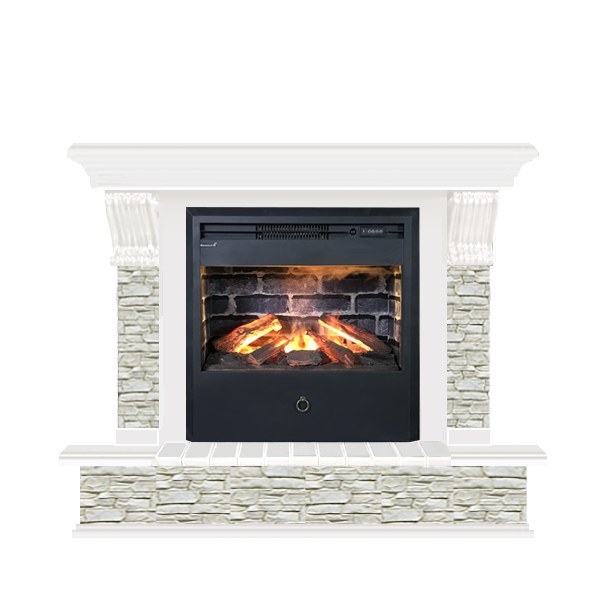 Glenrich (Гленрич) Панорама Samba 3D камень-Грот однотонный/цвет-Белый представляет собой современную модель камина, который работает от электросети. Удобное использование прибора достигается благодаря наличию пульта для дистанционного управления рабочими параметрами. Конструкция включает в себя облицованный камнем портал и очаг с объемным эффектом пламени.