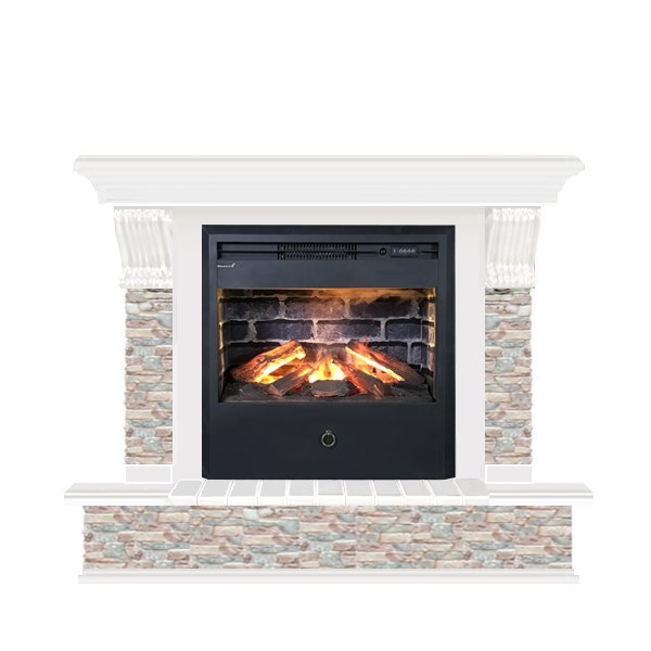 Glenrich (Гленрич) Панорама Samba 3D камень-Грот цветной/цвет-Белый представляет собой современную модель камина, который работает от электросети. Удобное использование прибора достигается благодаря наличию пульта для дистанционного управления рабочими параметрами. Конструкция включает в себя облицованный камнем портал и очаг с объемным эффектом пламени.