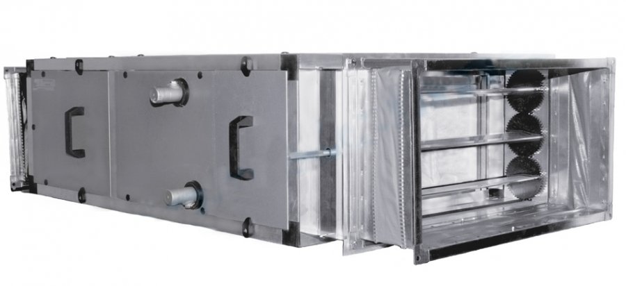 - Прямоточная схема расположения вентиляторов позволяет получить высокие аэродинамические характеристики установок;