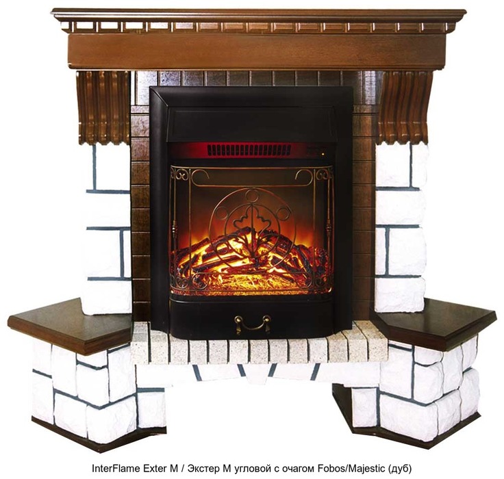 Каменный камин InterFlame (ИнтерФлейм) Exter М / Экстер М угловой с очагом Fobos/Majestic оснащен современный электрическим очагом, в котором очень реалистично реализован процесс горения огня, с дровами, пламенем и потрескиванием дров. Камин способен служить как обогреватель, мощность которого составляет 1,5 кВт. Данная модель предполагает угловую установку.