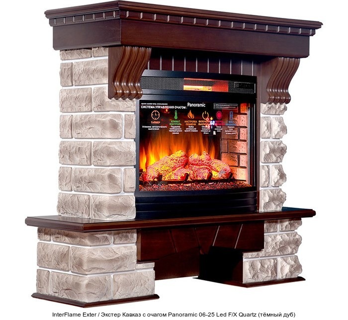 Электрокамин InterFlame (ИнтерФлейм) Exter / Экстер Кавказ с очагом Panoramic 25 LED FX QZхарактеризуется классическим дизайном и качественным исполнением. Производитель предлагает на выбор несколько цветовых решений, что поможет вам подобрать необходимый вариант. Очаг оборудован кварцевым обогревателем, мощность которого составляет 2 кВт.