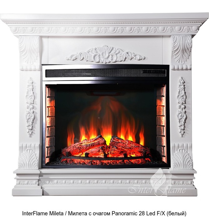 Комплект электрического камина InterFlame (ИнтерФлейм) Mileta / Милета с очагом Panoramic 28 LED FX – это красивое устройство, которое состоит из двух основных частей: портал и электрический очаг. Конструкция выполнена из качественных материалов, а электротопка собрала в себе лучшие технологические новинки. Для удобства регулировки настроек в комплекте поставляется пульт ДУ.