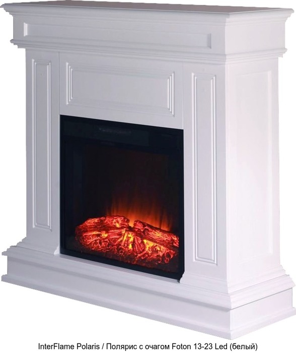 Деревянный камин InterFlame (ИнтерФлейм) Polaris / Полярис с очагом Foton 23 FX представлен в светлом цветовом оформлении, что добавляет порталу элегантности. Камин оснащен электрическим очагом, который очень реалистично показывает мерцание пламени, дополненного дровами, почти как настоящими. Устройство обладает функцией обогрева и имеет мощность 1,5 кВт.