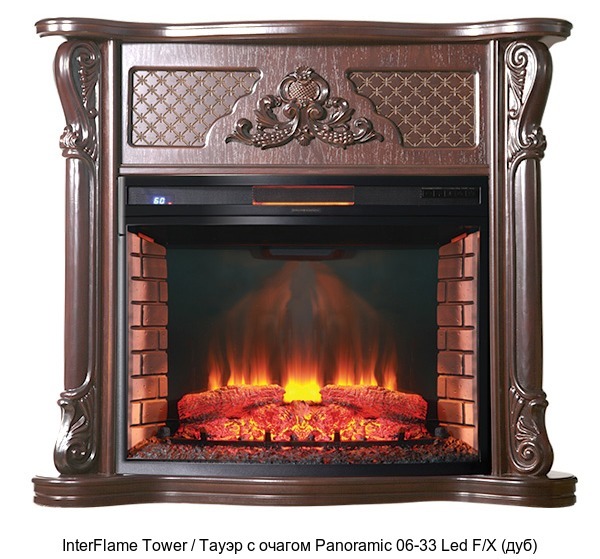 Комплект электрического камина InterFlame (ИнтерФлейм) Tower / Тауэр с очагом Panoramic 33 LED FX – это эффектное и стильное оборудование, около которого приятно скоротать вечер, сидя в мягком кресле. Данная модель укомплектована кварцевым обогревателем, который не сушит воздух и не сжигает кислород в помещении. Сделано в России.