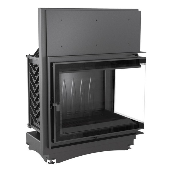 - Угловая топка с цельным Г-образным стеклом. Дверца топки распашная