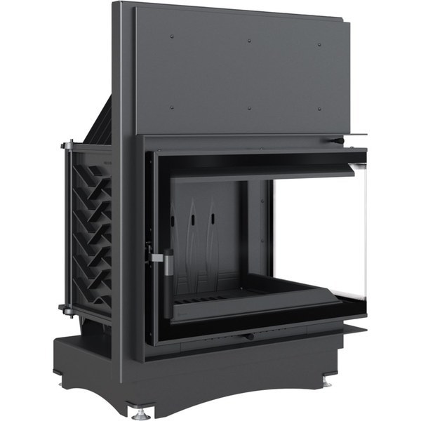- Угловая топка с цельным Г-образным стеклом. Дверца топки распашная