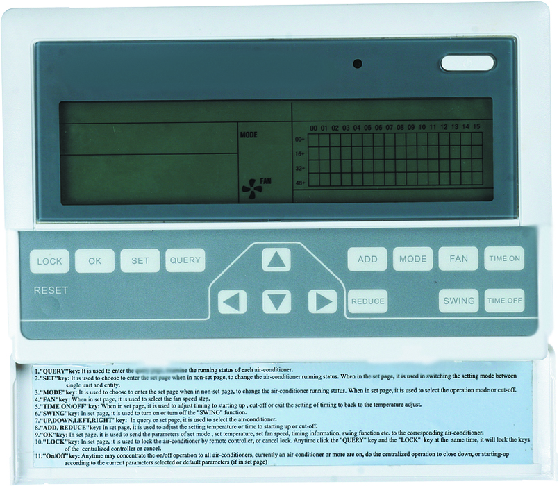 Центральный проводной пульт управления бизнес-класса Lessar LZ-UPW3B (Лессар) предназначен для управления полупромышленными мульти сплит-системами, а также мультизональными системами кондиционирования. Благодаря использованию такого пульта, вся система кондиционирования может контролироваться одним компетентным и ответственным лицом, обеспечивающим максимальную энергоэффективность оборудования. Пользователь может устанавливать необходимую температуру воздуха в каждом отдельном помещении, задавать рабочий режим и необходимые функции, а также контролировать работу всей системы при помощи информативного дисплея.