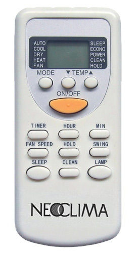Neoclima (Неоклима) ИК-пульт представляет собой удобный дистанционный управляющий модель беспроводного типа. Модель позволит регулировать работу канальных блоков этого же бренда, изменяя их установки: производительность вентилятора, температуру охлаждения или обогрева и т.д.
