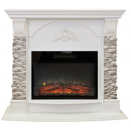 Real Flame Athena GR STD/EUG/25/24 WT с очагом Kendal 24 – эффектный каминокомплект, который украсит любое помещение и одновременно обеспечит его обогрев при необходимости. Портал камина представляет собой сочетание искусственного камня светло-серого цвета и качественного МДФ, имитирующего беленый дуб. Ажурная резная накладка, расположенная над очагом, изготовлена из деревянного шпона.