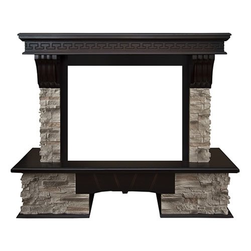 Real Flame (Реал Флейм) Rockland 26 портал под очаги: любой Moonblaze, Epsilon 26 S IR, Leeds 26 SD. Стиль старинных очагов Кантри. в качестве отделки стенок выступает материал, близкий по виду к природному камню в сером с коричневатым оттенком цвете. Плотная каминная полка и такая же столешница с узором, поддерживаемая консолями, из МДФ и шпона цвета античного дуба.