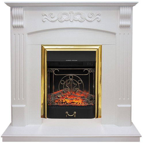Эффектный каминокомплект Royal Flame Sorrento с очагом Majestic FX Brass/Black (Роял Флейм) выгодно украсит интерьер помещения и подчеркнет вкус его владельца. Декоративная витая решетка на очаге и золотистое обрамление из латуни придает шика прибору и превосходно дополняет белый нарядный портал с широкой каминной полкой и резным декором. Две ступени мощности обогревателя позволяют управлять интенсивностью подогрева воздуха в холодную погоду.
